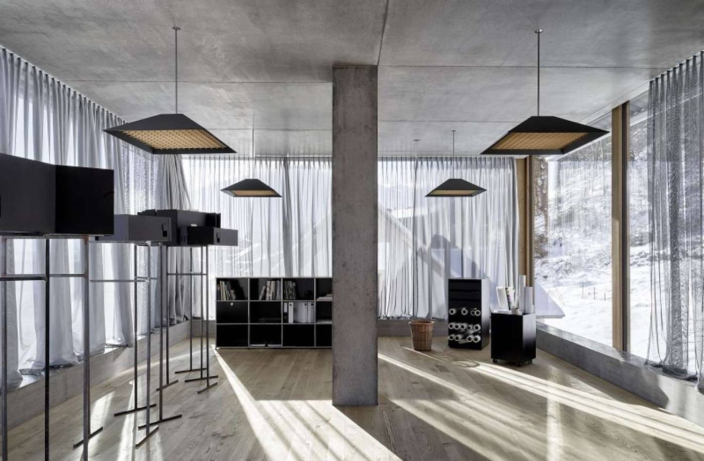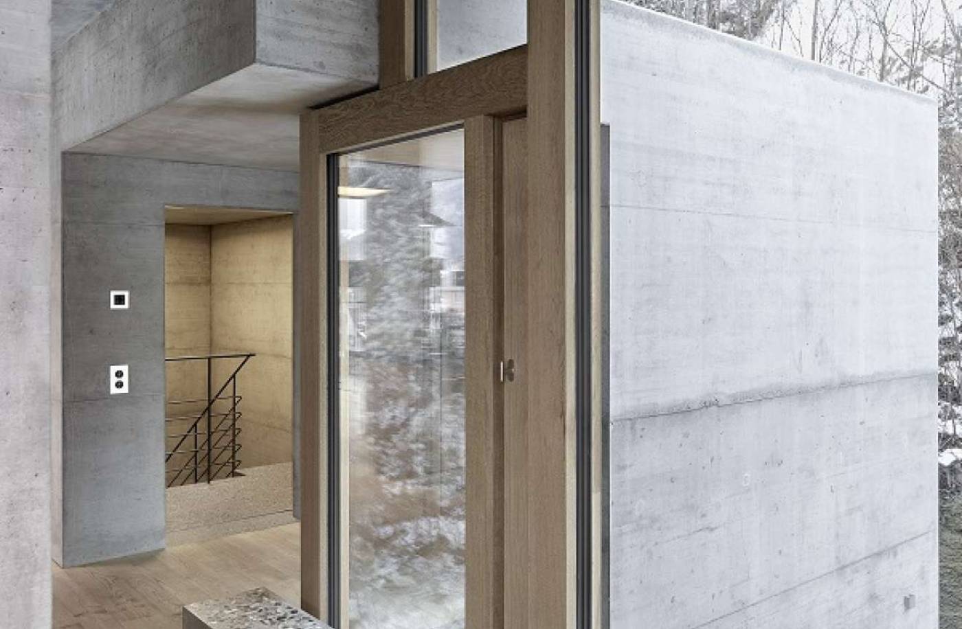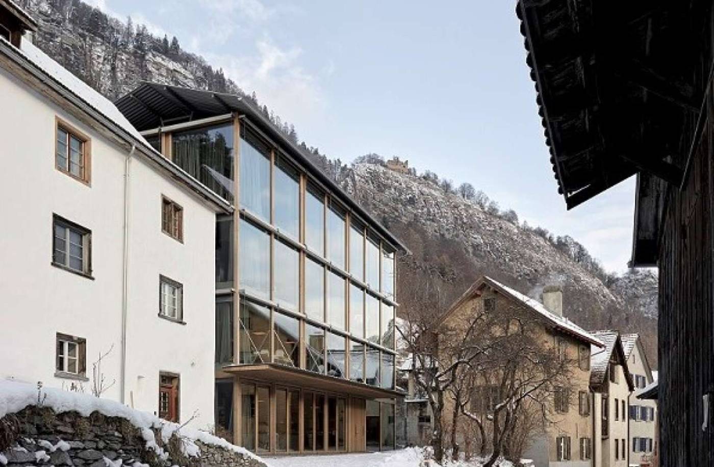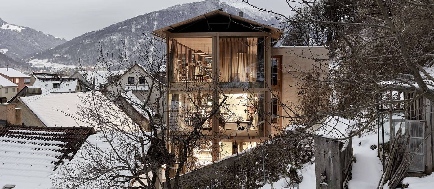 Das neue Ateliergebäude steht leicht von der Dorfgasse zurückversetzt. Früher war dies der Platz einer grossen Stallscheune, deren hintere Aussenmauer den Hang stützte. Der Neubau berührt diese Mauer nur an einer Stelle mit der vertikalen Erschliessung. Ansonsten steht das viergeschossige Glashaus selbstständig davor. Es ist aus zwei Tragwerken gebildet: Eine einfache und starke innere Betonstruktur in Sichtbeton trägt die auskragenden Flachdecken, eine äussere Holzstruktur alle Elemente der Fassade.