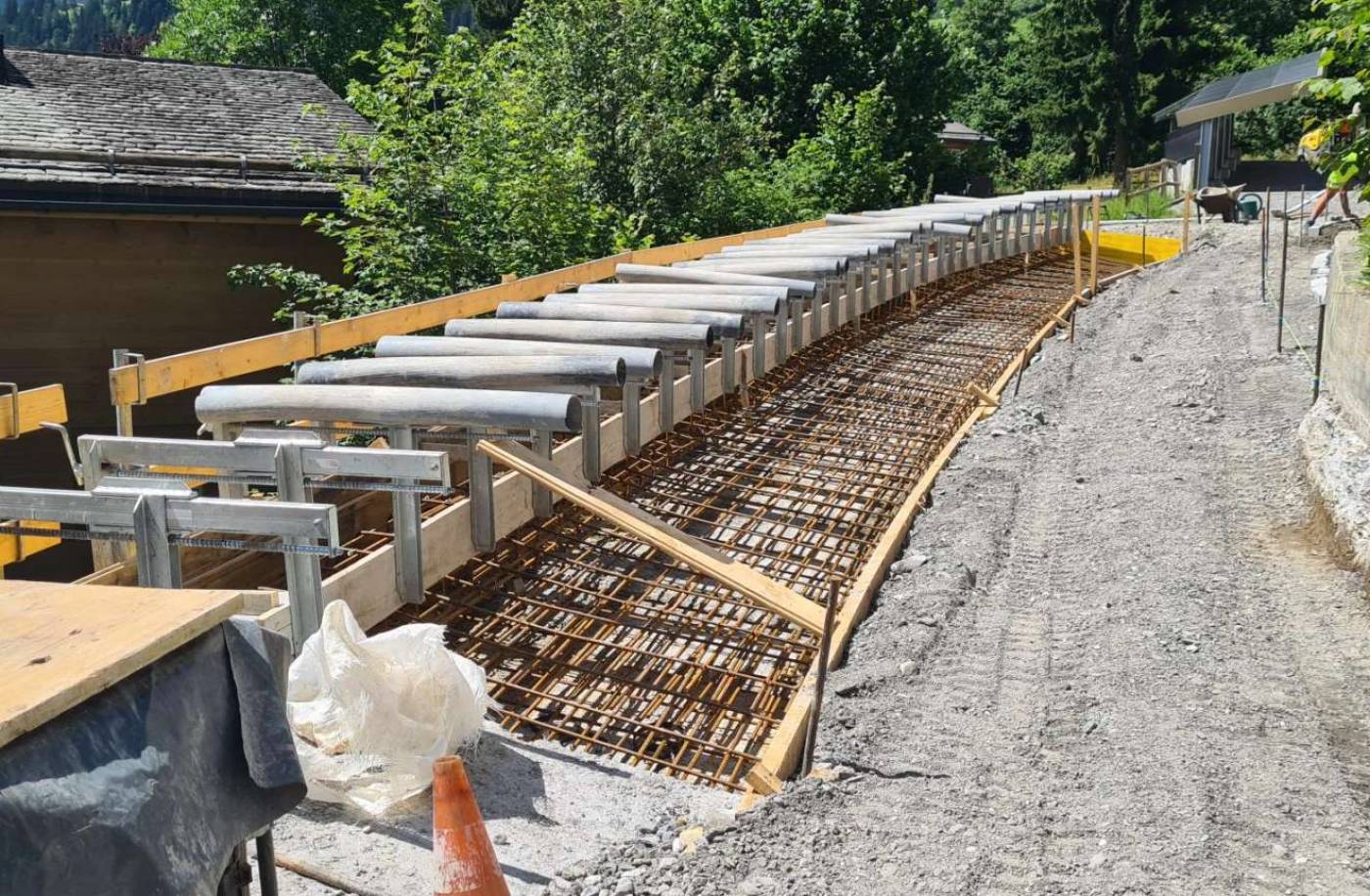 Durch Auskragung auf der bestehenden maroden Stützmauer wurde die Standsicherheit wiederhergestellt und zugleich der Strassenkörper verbreitert. So ist nun auch die Zufahrt für Räum- und andere Unterhaltsfahrzeuge möglich. Die Betonarbeiten wurden durch die Firma Candrian SA, die Belagsarbeiten durch die Coray Bau Laax AG ausgeführt.