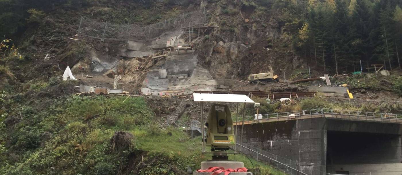 La parete rocciosa situata al portale Nord della galleria, durante la messa in sicurezza, è sorvegliata tramite un monitoraggio automatico geodetico e geotecnico.