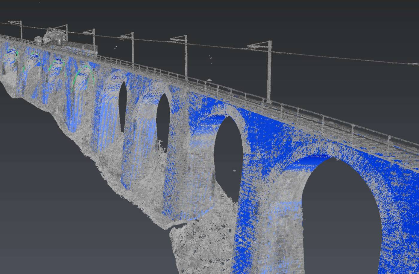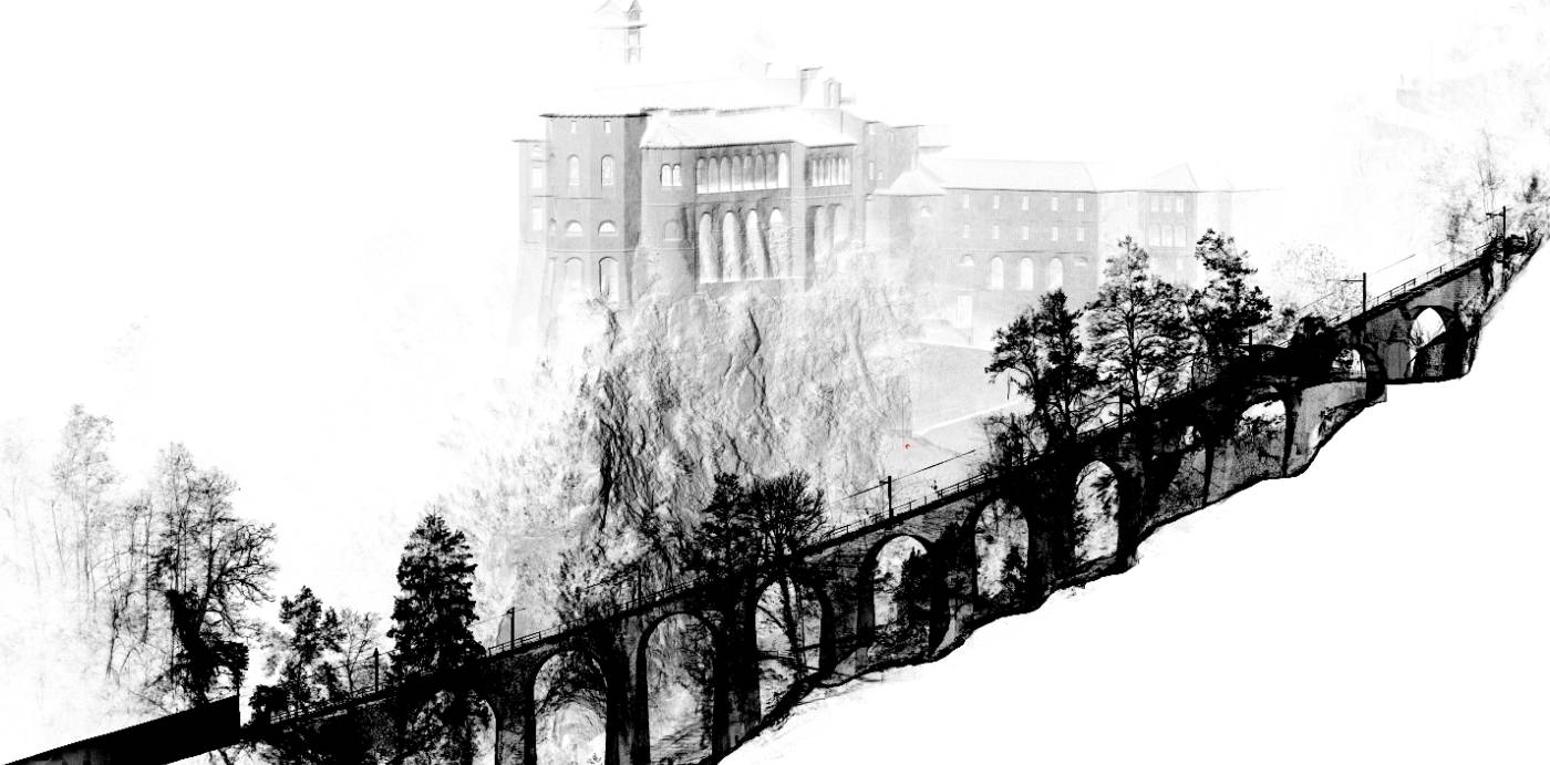 Per la pianificazione e progettazione di alcuni lavori di rinnovo della funicolare Locarno - Orselina, il committente ha richiesto un rilievo del viadotto sottostante alla fermata della Madonna del Sasso e della seguente galleria. I rilievi sul terreno, date la difficoltà di accesso e la complessità dell'oggetto, sono stati effettuati grazie all'impiego di un laserscanner terrestre 3D. Grazie al calcolo di una nuvola di punti ad alta risoluzione, l'intero perimetro é stato successivamente modellizzato in 3D. Il cliente ha quindi a disposizione dati affidabili e precisi quali aiuto alla pianificazione.
