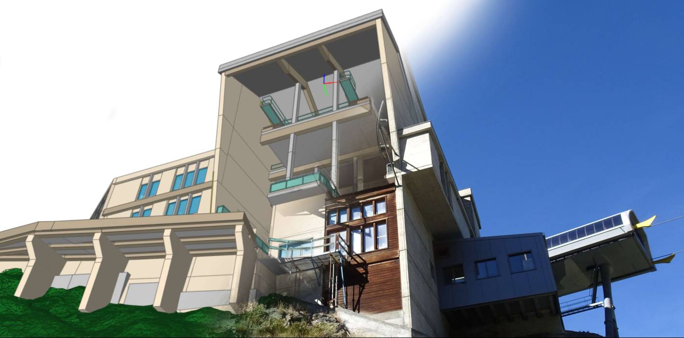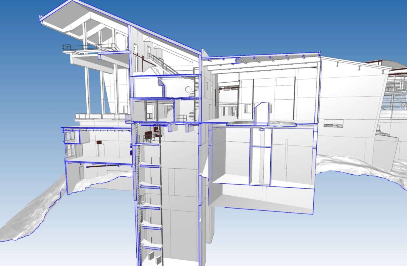 Se non disponete di piani per i vostri progetti di costruzione, come ristrutturazioni e rinnovi, possiamo rilevare con precisione i vostri edifici, sia all'interno che all'esterno, utilizzando procedure specializzate e tecnologie all'avanguardia per creare un gemello digitale. A tal fine, selezioniamo il metodo di rilevamento più adatto alle vostre esigenze, come scanner laser 3D, tachimetro o fotogrammetria. Per la sostituzione della funivia esistente Zermatt - Furi, è stato creato un modello 3D compatibile con BIM per entrambe le stazioni. In questo modo, tutti i progettisti e gli imprenditori dispongono della stessa base di progettazione, evitando così imprevisti.